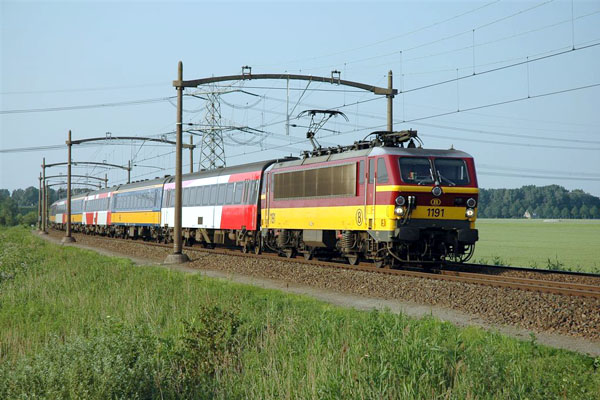 Dordrecht Wieldrechtse Zeedijk, 5 juni 2007. NMBS-loc 1191 met deels al in HSL-kleuren bestickerde rijtuigen. Binnenkort is ook dit beeld geschiedenis. De Belgische locs, die moeite hebben met de steile hellingen bij het Antwerpse station (zodat de treinen zijn ingekort) worden vervangen door Traxx-locomotieven. In 2008 gaan deze treinen via de nieuwe HSL rijden. Foto Rob van der Rest. |