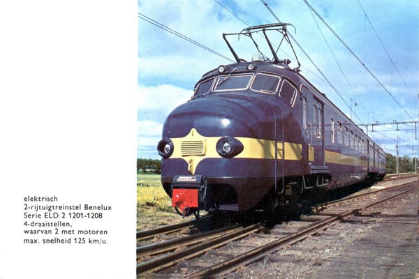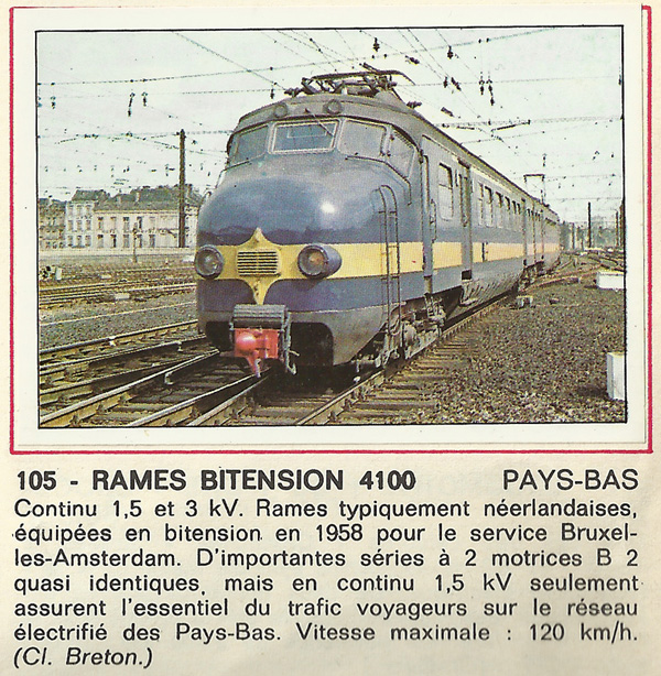 Een Beneluxtreinstel, zo te zien gefotografeerd in Brussel. Ik begrijp niet waar het serienummer 4100 op slaat. Bron: een Frans plakplaatjesboek uit de jaren 70. |