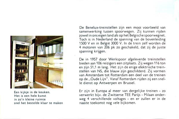 In 1957 werden Amsterdam, Antwerpen en Brussel rechtstreeks en elektrisch met elkaar verbonden. Voordien reden er wel internationale treinen, maar minder frequent en alleen met toeslag en reservering. De Beneluxtreinstellen leken op de Nederlandse Hondekop maar kregen eigen kleuren en konden overweg met de spanningsverschillen tussen beide landen. De twee nationale spoorwegmaatschappijen lieten ter promotie foto's en affiches maken. De Beneluxtrein — die overigens nooit Luxemburg zou bereiken — stimuleerde de samenwerking tussen de buurlanden. In 1958 werd deze bekroond met de vorming van de Benelux Economische Unie. Lees het artikel op retours.nl (Arjan den Boer, september 2014). |