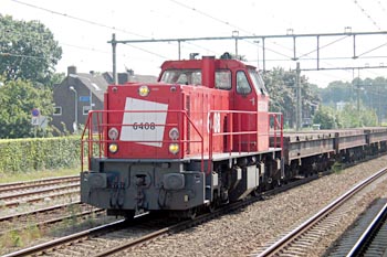 Hilversum, 9 augustus 2004. Loc 6408 met een rij platte wagens uit Amersfoort. |