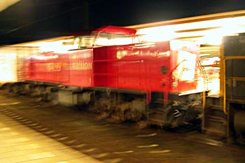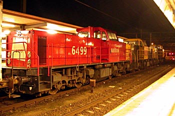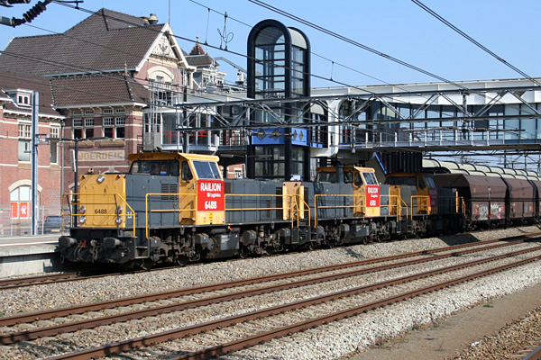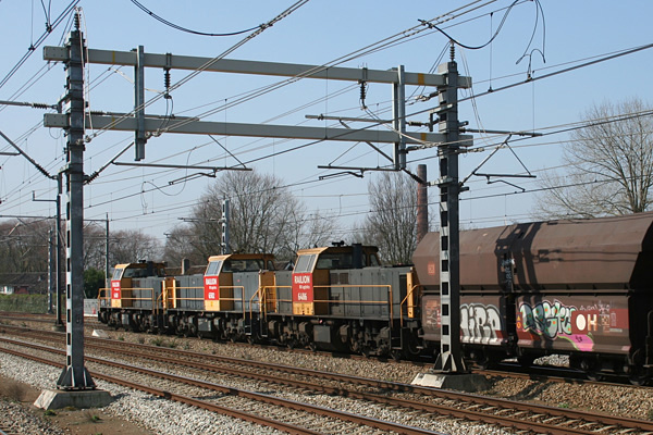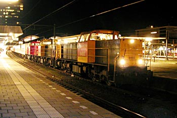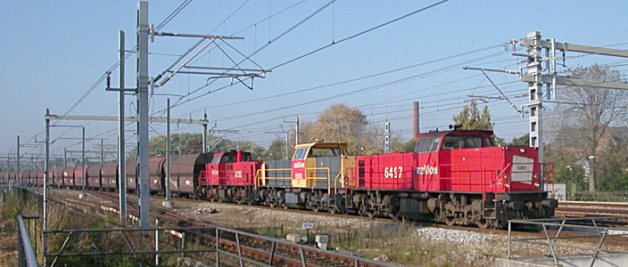 Woerden, 11 oktober 2005. Kolentrein op weg van Rotterdam naar Duitsland, getrokken door locs 6497, 6503 en 6496. De twee rode locs zijn "Duitse Herders". Deze zijn behalve van ATB ook voorzien van Indusi en mogen daarom in Duitsland dienstdoen. De middelste loc is ook in Duitsland toegelaten maar beschikt niet over Indusi. Deze loc mag daarom alleen tussen twee Duitse Herders de grens over. Enkele andere locs van de serie 6400-6500 hebben de bijnaam "Vlaamse Reuzen", omdat ze in België mogen rijden. |