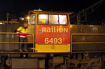 Utrecht Centraal, 27 februari 2005. Railion-locs 6493, 6503 en 6499 staan tien minuten stil met hun containertrein. Het sein staat al weer op groen als de machinist komt aangesneld. |