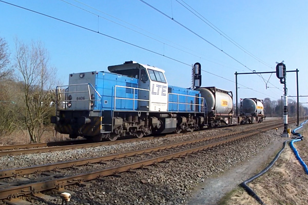 Utrecht, Mereveldseweg, 12 maart 2016. Loc LTE 6406 brengt twee tankcontainers van Arnhem naar Rotterdam. De containers van Bertschi zaten in een trein die onderweg was van Rotterdam naar Weil am Rhein (bij Basel). Op de Betuweroute raakte de wagen waar ze op stonden defect: de remversteller liep vast. De containers werden op een andere wagen geplaatst. Daarna werden ze met een privétreintje teruggebracht naar het RSC (Rail Service Center) aan de Waalhaven voor een nieuwe poging. |
