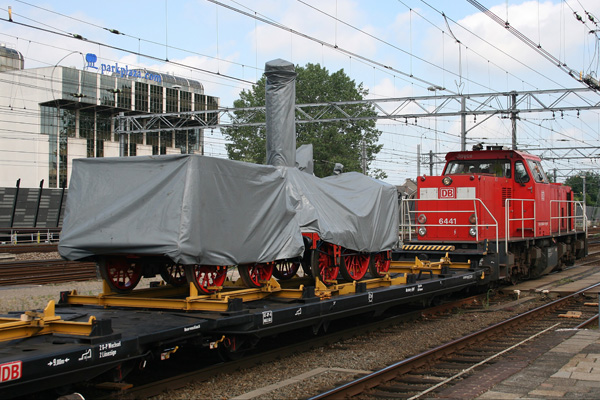 Driebergen en Utrecht, 16 juli 2014. Loc 6441 met een trein op weg naar het Spoorwegmuseum. Onder het dekzeil bevindt zich de Adler van het Verkehrsmuseum Nürnberg, die enige maanden in Utrecht te zien zal zijn. Foto's Jordy Kronenburg en Marc Kessen. |