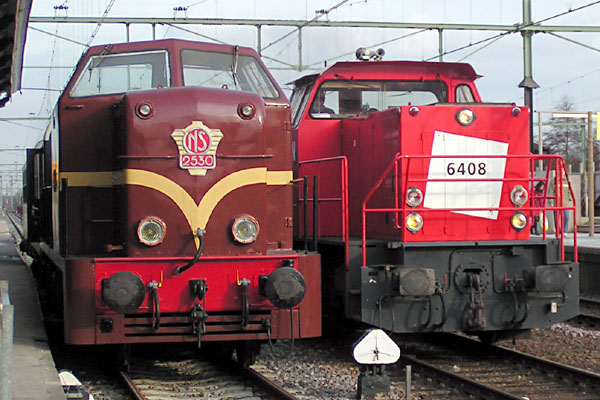 Apeldoorn, 7 maart 2006. Loc 2530 (jaren 50) naast loc 6408 (jaren 80). Need I say more? En wat kost dat nou helemaal extra, even die huif een paar rondingen meegeven? Foto Rick Dijkstra. |
