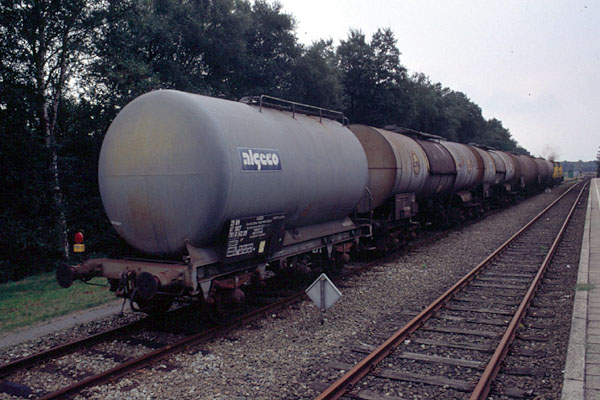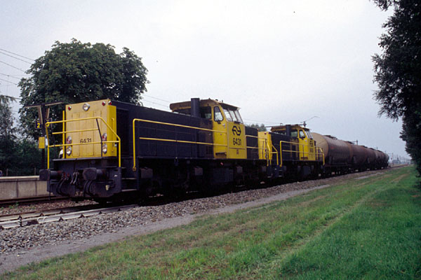 Mariënberg, 19 augustus 1994. Een olietrein met locs 6431 en 6436, op weg van Coevorden naar Almelo. |