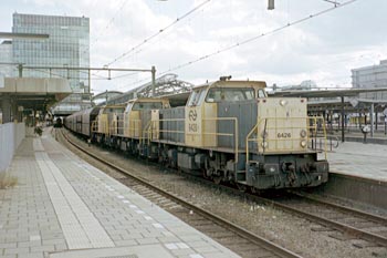 Utrecht, 27 augustus 2001. Loc 6426 en twee collega's met aan de haak een kolentrein. Tweede foto: Utrecht Overvecht, 15 juni 2002. Een driespan 6400 met een omgeleide trein uit Amsterdam. |