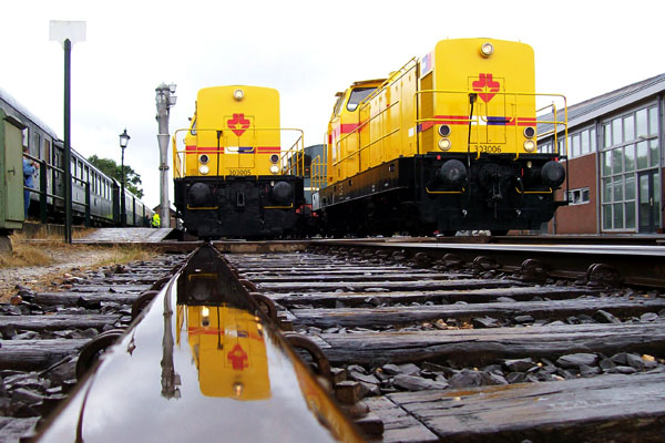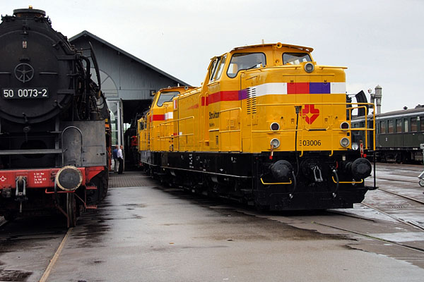 Beekbergen, 24 juni 2007. De nieuwe aanwinsten van Strukton: twee tweedehandsjes, genummerd 303005 en 303006. Strukton Railinfra beschikt nu over vier rangeerlocs van het type Deutz 1200. Foto Ted Assenberg. |
