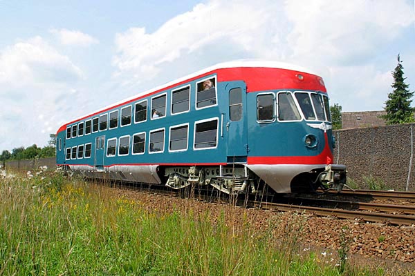 Bilthoven, 24 juli 2004. Aanvankelijk was het idee om de DE2-stellen uit te voeren als dubbeldekkervariant van de DE1. Dit vanwege de naoorlogse materiaalschaarste: voor een dubbeldekker is nu eenmaal minder materiaal nodig dan voor een tweewagenstel. Uiteindelijk heeft men van dit idee toch moeten afzien, onder andere omdat er geen geschikte motoren beschikbaar bleken te zijn voor deze relatief zware uitvoering. Bij deze artist's impression is het dan ook gebleven. |