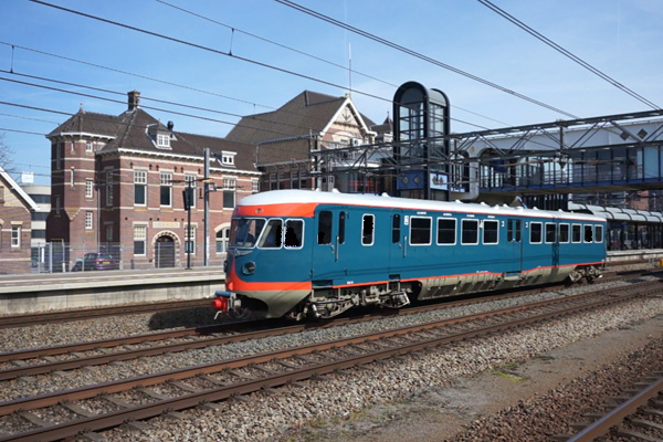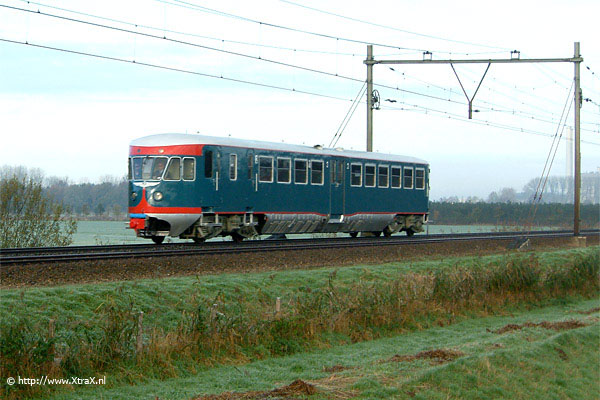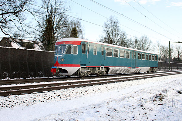 Bilthoven, 6 maart 2006. Blauwe Engel 41 is op weg van het Spoorwegmuseum naar de werkplaats Tilburg. Omdat treinen vanaf het museum naar Lunetten niet links kunnen rijden, is er een flinke omweg nodig. Het motorrijtuig heeft zojuist kop gemaakt op het middenspoor tussen Bilthoven en Den Dolder. Voor de fotograaf is dit leuk, want die ziet de trein twee keer langsbrommen. |