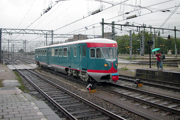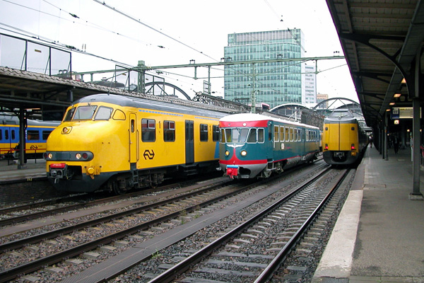 Utrecht Centraal, 11 augustus 2006. Motorrijtuig DE1 41 van het Spoorwegmuseum komt uit de loods Utdd en maakt kop op spoor 10 om zijn reis voort te zetten naar de werkplaats Aswplz. Daar zal het motorrijtuig enig onderhoud ondergaan. Rechts op de tweede foto staat intercity 557 naar Groningen, links intercity 12557 naar Leeuwarden die regulier wordt gereden met drie stellen plan V. |
