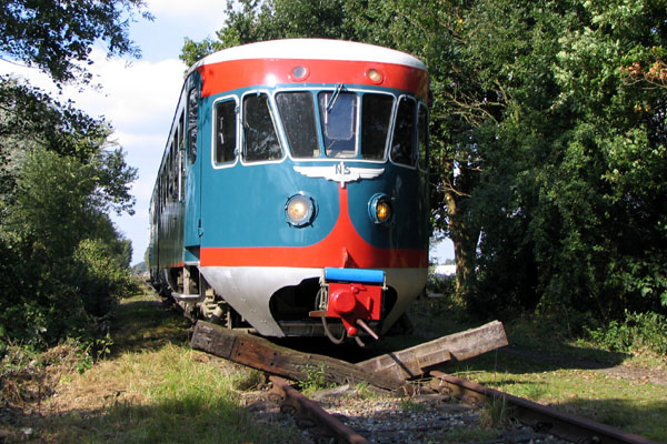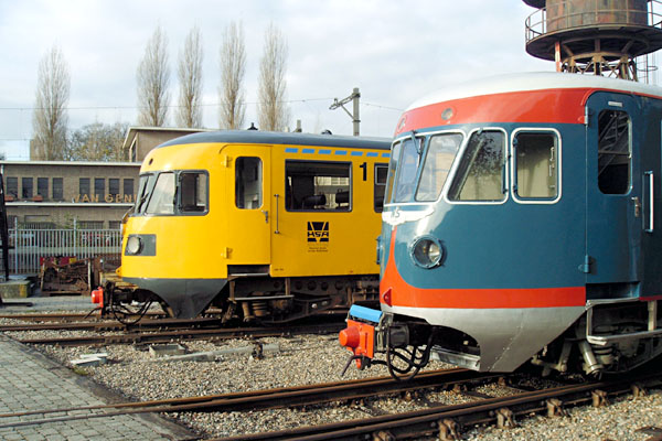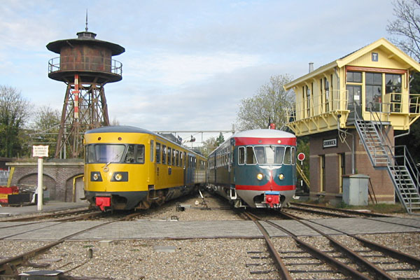Watergraafsmeer, 28 augustus 2004. Treinstel 41 van het Spoorwegmuseum en de gele 180 van de HIJSM (Haarlem-IJmuidense Spoorweg Maatschappij). In maart 2020 is het treinstel overgedragen aan Rail Pleasure, die een recreatief spoorfietsbedrijf exploiteert tussen Hengelo en Twekkelo. Treinstel 180, teruggebracht in de blauwe kleur, is bestemd als wachtgelegenheid in Twekkelo. |