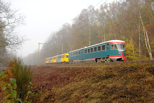 Oosterbeek Hoog, 19 november 2005. DE2 186 van de stichting Historisch Streekvervoer Achterhoek (HSA) gaat een bezoek brengen aan het Spoorwegmuseum. In opzending reed vanaf Zutphen motorrijtuig DE1 41 mee naar Utrecht. Foto Hugo Richter. |