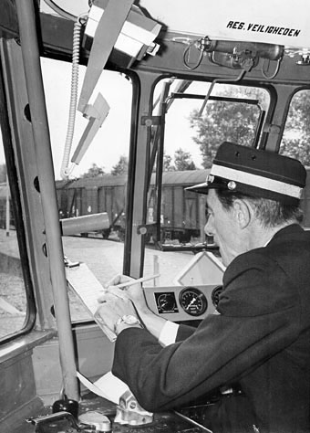 Twee motorrijtuigen, twee-wagentreinstellen of een motorrijtuig en een twee-wagentreinstel, kunnen tegelijk door één man worden bediend. (...) Het twee-wagentreinstel biedt plaats aan honderd zeven en negentig personen. Het andere kan ruim honderd reizigers vervoeren." Algemeen Handelsblad, 13 mei 1953. |