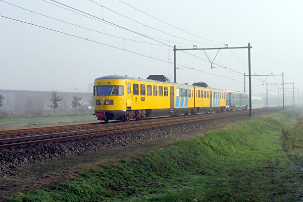 Windesheim, 19 november 2005. DE1 41 is voor onderhoud in Zwolle geweest. Bij wijze van verrassing vond de terugrit naar het Spoorwegmuseum plaats in combinatie met een rit van de HSA. Hier is het motorrijtuig op weg naar Zutphen, waar de koppeling met zijn gele broer zal plaatsvinden. Foto Fokko van der Laan. |