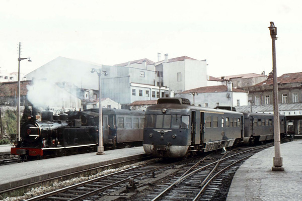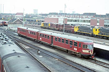 Overstappen in Tiel, op 21 augustus 1983. Links treinstel 853 uit Utrecht, rechts treinstel 173 naar Nijmegen. |