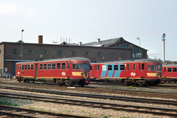Mariënberg, 24 augustus 1995. Links treinstel 169 in de dienst op Almelo, rechts treinstellen 2101 en 2106 als trein naar Emmen. |