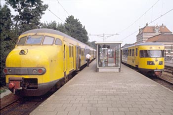 Kerkrade, 13 mei 1988. Veel belangstelling voor treinstel 179, vlak voor het buiten dienst gaan van de Miljoenenlijn. Tweede foto: Arnhem, 24 oktober 1992. Treinstel 169. |