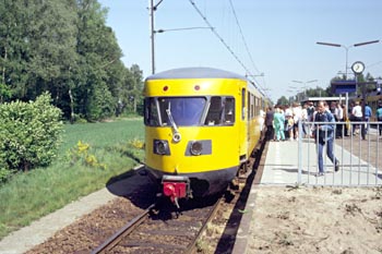 Bilthoven, 24 juli 2004. Motorrijtuig 41 tijdens een overbrengingsrit. Het rijdt van Tilburg via Lunetten en het Spoorwegmuseum, en zal op het middenspoor tussen Bilthoven en Den Dolder kopmaken, om daarna naar Utrecht Centraal en de HTMU-loods te rijden. De bovenste foto maakte ik om 12:56 uur vlak bij de overweg in de Leijenseweg. Een kilometer verderop stond Dennis Revier met zijn camera op het perron van Bilthoven. Na het kopmaken legde Martin Kaptein het motorrijtuig vast bij de overweg bij het station. En even later, om 13:11 uur, kreeg ik de trein weer voor mijn lens, met in de achtergrond de overweg in de Leijenseweg. |