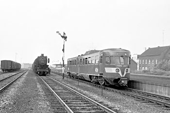 Valkenburg, 10 augustus 1970. Motorrijtuigen 46 en 45 als trein naar Heerlen. Tweede foto: Simpelveld, 15 augustus 1970. Motorrijtuig 29 vertrekt naar Heerlen. Links stoomloc 050 788 met een goederentrein naar Aachen. |