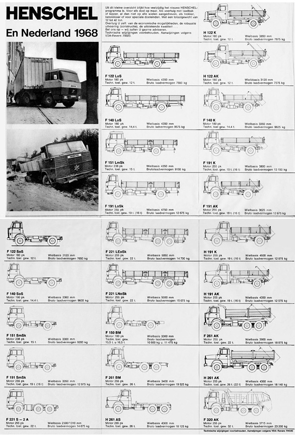 Behalve locomotieven heeft Henschel ook zware vrachtwagens gemaakt. Hierboven een foldertje dat werd uitgegeven ter gelegenheid van de bedrijfswagen-Rai 1968. In 1969 ging Henschel samenwerken met Hanomag, die net als Henschel van oorsprong ook locomotieven bouwde. De Henschel-ster op de grill werd vervangen door het Hanomag-Henschel-logo. Nadat Mercedes in 1970 alle aandelen had overgenomen werden de trucks geleidelijk onder de naam Mercedes en met de Mercedes-ster verkocht. In 1974 werd de productie helemaal gestopt. Met dank aan Henk Koster. |