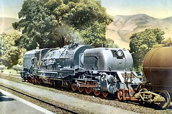 Beyer-Garratt-locomotief van de South African Railways op het traject Waterval-Komatipoort, in 1953/54 gebouwd door Henschel. Spoorwijdte 1067 mm (Kaapspoor). Een Beyer-Garratt bestaat uit twee locomotieven met een gemeenschappelijke ketel. Achter het machinistenhuis bevindt zich de brandstofvoorraad en een deel van de watervoorraad. Het andere deel van de watervoorraad bevindt zich voor de rookkastdeur. Fabrieksfoto. |