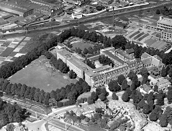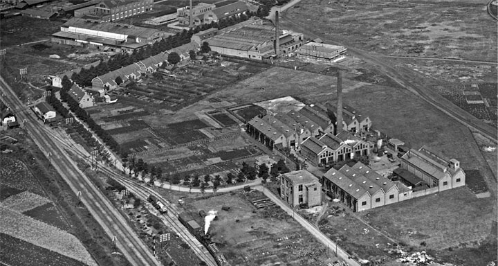 De luchtfoto dateert uit 1924 en toont de fabriek net na de laatste uitbreiding. Even