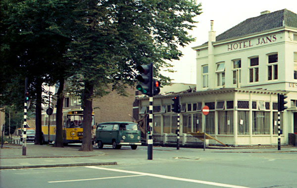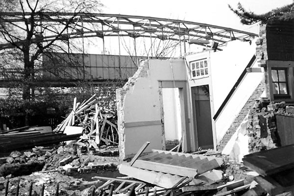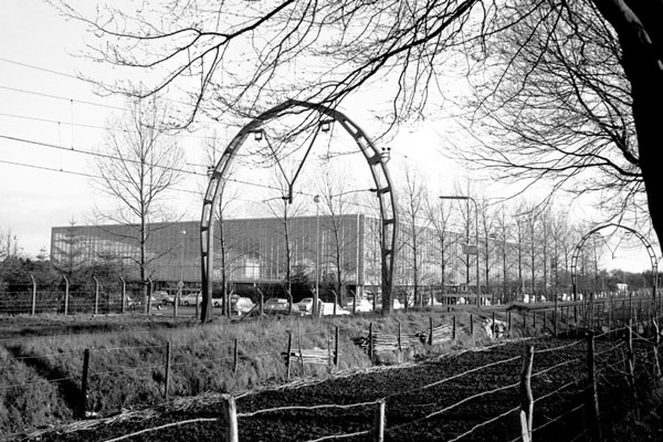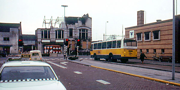 Hilversum, 24 februari 1974. De strakke zakelijkheid van de Expohal in gesprek met de gothische bogen van de Gooilijn. Foto Nico Spilt.