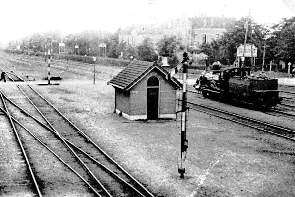 Op de voorgrond het verbindingsspoor waarover locomotieven van de Gooische Stoomtram naar het NS-depot konden rijden om bevoorraad