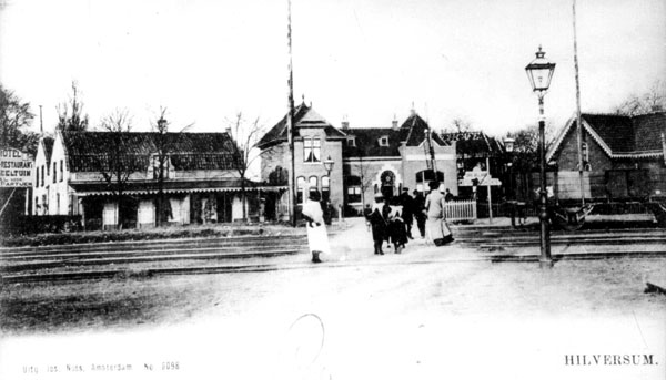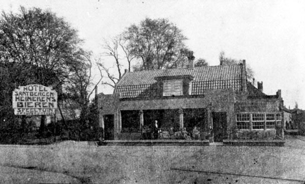 Aan de Noorderweg, recht tegenover de grote spoorbomen, staan Hotel Santbergen en het station van de Gooische Stoomtram