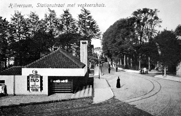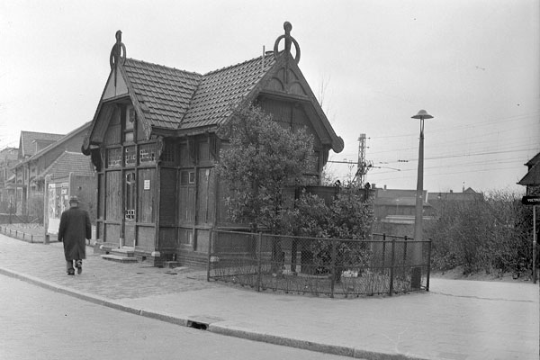 in 1932 afgebroken. Achter het gebouwtje is de overweg Laarderweg (rechts) - Stationsstraat (links) te zien, de latere