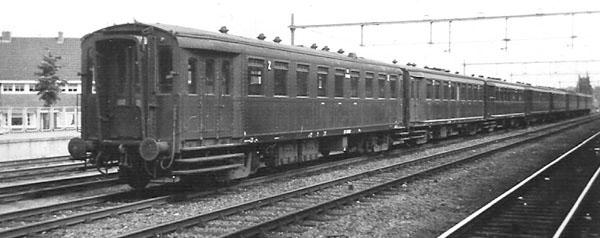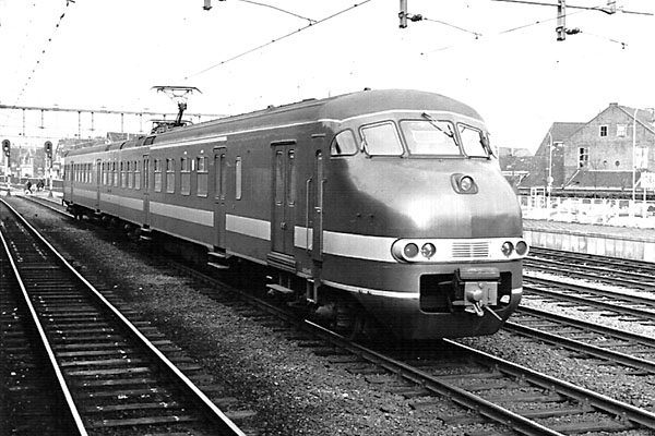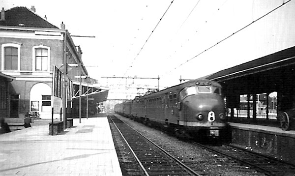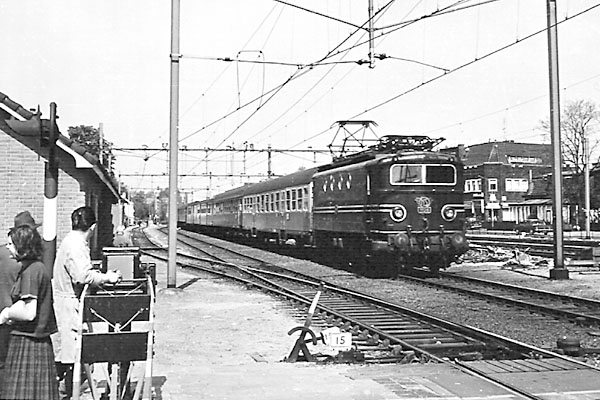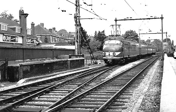 Hilversum, 27 september 1964. Hondekopmaterieel, nog in de oorspronkelijke kleurstelling, gefotografeerd vanaf de voetgangersbrug, op weg van Amsterdam naar Amersfoort. Het handwissel linksonder leidt naar het kopspoor waar treinstellen uit de pendeldienst Hilversum-Utrecht (die toen nog één keer per uur reed) werden opgesteld, zodat ze spoor 1 niet blokkeerden. Foto Adriaan Pothuizen. |