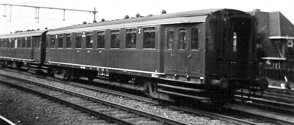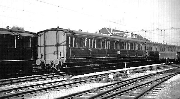 Hilversum, 9 juli 1961. Op spoor 5b staat een rij voormalige Blokkendoosrijtuigen, bestemd voor een militairentrein. Van voor naar achteren B5820, B5111, B5106, B5839, A5506, B5819, B5710, B5816. Op de onderste foto links B5710 (verongelukt bij Harmelen in 1962), rechts B5816 (afgevoerd december 1961). Foto's Adriaan Pothuizen. |
