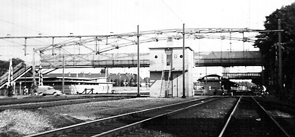 Hilversum, 16 juli 1961. In de deur van Post T poseren overwegwachter Klaas de Ruyter (links) en treindienstleider Jan de Ruyter. Het zijn twee neven. Adriaan Pothuizen schrijft hierover: "Bij Klaas kwam ik al als 7-jarige op Post I (de kleine bomen), als hij als seinhuiswachter dienst had. Jan was een 'strenge' roodpet die ik pas wat later leerde kennen. Hij deed, net als zijn collega’s, een week dienst als perronopzichter en dan weer een week als trdl, etc. Op het perron kon hij wat kortaf doen, maar op Post T was ik (bijna) altijd welkom. Op Post T mocht Klaas alleen de bomen openen en sluiten, hij was als shwt blokstelsel III met alleen LO niet geschikt bevonden voor de NX, daar moest je MULO voor hebben, zoals Jan..." De onderste foto is gemaakt vanaf het stootblok van spoor 9, zuidwaarts blikkend. In de verte, achter de voetgangersbrug, is de brug te zien die de twee perrons van Hilversum met elkaar verbond. Deze was niet voor het publiek bestemd. Foto's Adriaan Pothuizen. |