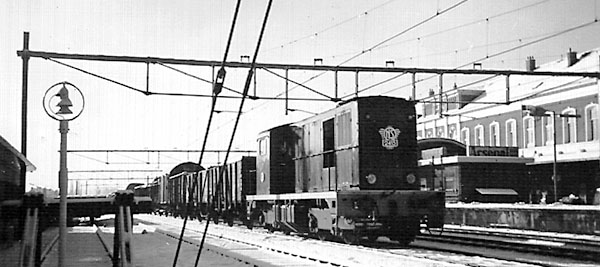 Hilversum, 15 februari 1968. Loc 2209 met bollenwagens, met achterop de trein loc 2278. Het betreft hier een proef met de bediening van een tweede loc “op afstand”, via een kabelverbinding door de trein. De opgedane ervaringen zijn toegepast in de latere trek-trektreinen, bestaande uit twee 2200'en en een aantal aangepaste rijtuigen Plan E. Op de onderste foto vertrekt de proeftrein via spoor 5a naar Amersfoort. Foto's Adriaan Pothuizen. |