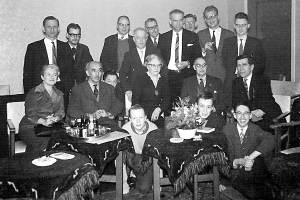 Hilversum, 21 februari 1962. Bijeenkomst van NVBS-sectie ’t Gooi in Hotel Santbergen. Achterste rij v.l.n.r.: Wijnbergen (werkte bij het toenmalige mediawezen en heeft wel eens een filmavond georganiseerd met "The Titfield Thunderbolt"), Willemsen (jarenlang trdl Brn), Postma, Roelofsen (had een functie bij de gasfabriek en woonde daar op het terrein), onbekend, Van Uden, onbekend, Laterveer, Hageman. Middelste rij: onbekend, ir De Bruijn Kops (bekend van boeken, werkte ooit bij Locomotieffabriek Ducroo & Braun te Weesp), het hoofd van Dolf Blokker (had een slagerij op de hoek van de De Bazelstraat en de Lage Naarderweg), mevr. Ruys, Huisman (sectieleider NVBS-sectie 't Gooi, werd na zijn plotselinge overlijden opgevolgd door Roelofsen), Van Wijck Jurriaanse. De drie jongens op de voorgrond zijn Henk Renou (later een bekend filmer, overleden in 2000), Ton Pruissen en Adriaan Pothuizen. Hotel Santbergen is later omgebouwd tot opleidingscentrum van de Hilversumse omroep. Foto Hans Verweij, collectie Adriaan Pothuizen. |