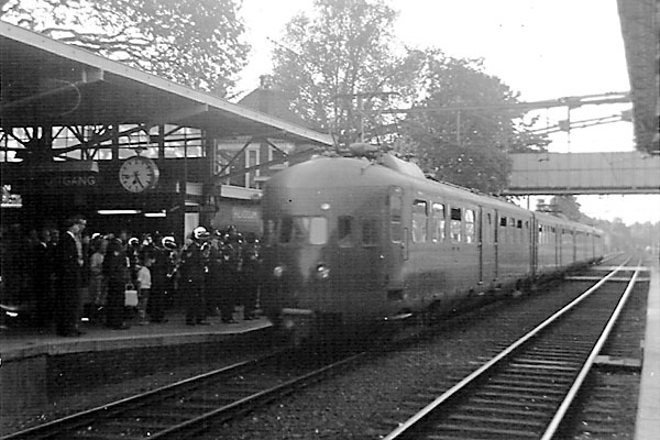 Hilversum, 19 februari 1961. Treinstel 413 vertrekt naar Amsterdam. Vier jaar later zou de voetgangersbrug worden gesloopt. Foto Adriaan Pothuizen. |