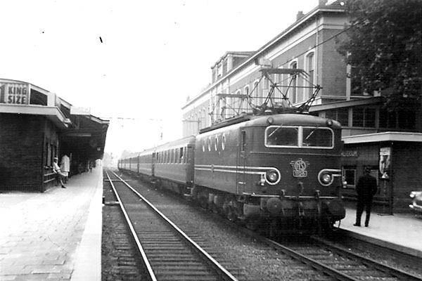 Hilversum, 7 augustus 1963. Op spoor 1 staat loc 1126 met trein 13778 gereed voor vertrek naar Amsterdam. Het gaat om een (zaterdagse) extra trein, maar de reden is niet bekend. Foto Adriaan Pothuizen. |