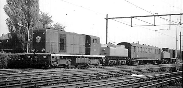 Hilversum, 6 april 1963. De rangeerloc is op eigen kracht als trein 8471 van Utrecht naar Hilversum gereden (aankomst 12.35) om een 2400 op te halen die uit Naarden-Bussum kwam. Op deze zaterdag was dat loc 2523, die als trein 8821 in Hilversum arriveerde. Het duo vertrok om 13.20 naar Amersfoort. Een zeer curieuze dienstregeling, waarvan de reden niet bekend is. Foto's Adriaan Pothuizen. |