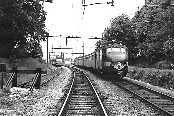 Tussen Hilversum en Hollandsche Rading, zomer 1967. Gietijzeren overwegbeveiliging. In de verte een treinstel uit de serie 321-365 als stoptrein Hilversum-Utrecht. Foto Adriaan Pothuizen. |