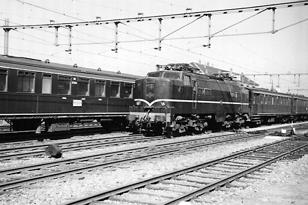 Hilversum, 3 mei 1966. "Wachten voor de grote overweg". Trein 221 Amsterdam-Enschede komt binnen op spoor 2, getrokken door loc 1128. De Duitse rijtuigen achter de loc zullen vanaf Enschede als trein 876 doorgaan naar Gronau en Münster. Foto Adriaan Pothuizen. |