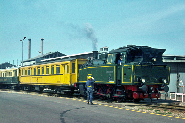Velsen, 26 mei 1973. Loc 57 met de Hoogovens-excursietrein tijdens een NVBS-excursie. Deze loc kreeg later de naam 'Bonne'. Ook kwam er een tweede loc, nummer 22 'Tom'.