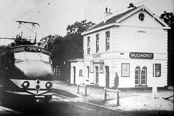 Station Hulshorst in 1913, versierd ter gelegenheid van het 50-jarige bestaan van de NCS. Foto uit het gedenkboek Dienstorder 621 van de Nederlandsche Centraal Spoorweg Maatschappij, 1913. |