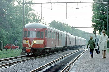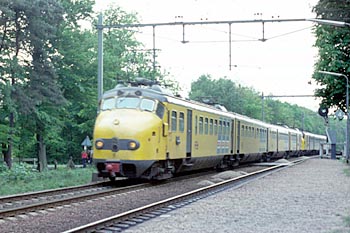Hulshorst, 24 mei 1974. Treinstellen 761 en 712 als intercity 553. Tweede foto: de laatste rit van DE5-treinstel 188, op weg van Amsterdam naar Zwolle om daar te worden opgeborgen. |