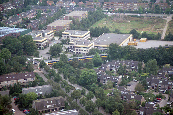 Bilthoven, 6 september 2002. Overweg in de Leijenseweg gezien vanuit een luchtballon. Er passeert juist een Koploper.