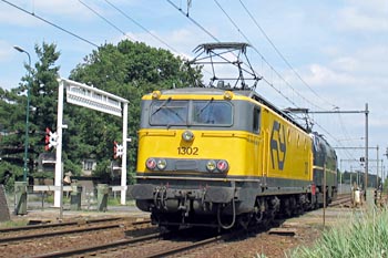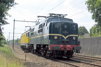 Bilthoven, 12 juli 2003. Loc 1202 heeft zojuist in het Spoorwegmuseum loc 1302 opgepikt. Beide locs zijn eigendom