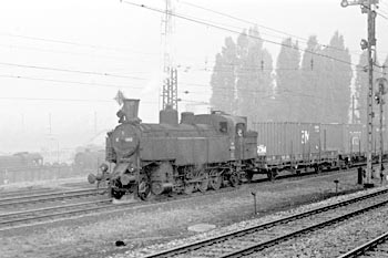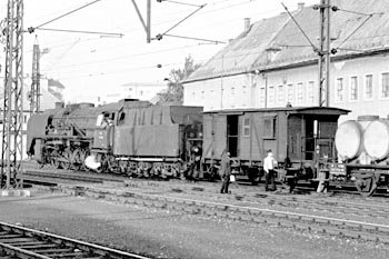 Linz Hbf, 19 september 1971. Stoomloc 50.1805 met een gemengde goederentrein. Het treinpersoneel rookt een sigaretje