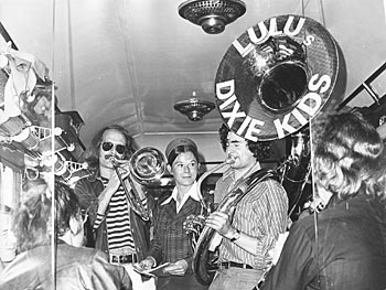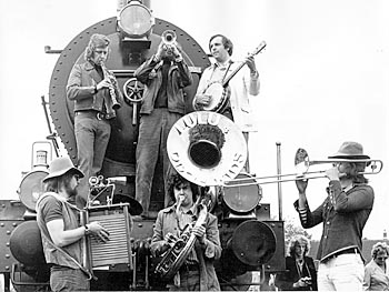 Kesteren, 21 mei 1974. In 1974 kwam loc 3737 weer op de baan, na jarenlang te hebben stilgestaan in het Spoorwegmuseum. Tijdens de persrit traden Lulu's Dixie Kids op. De linkerfoto is gemaakt door Martin van Oostrom. Naast loc 3737 staat Dick van Aggelen. De rechterfoto kreeg ik van de man met de sousafoon: Paul Habraken, www.acesofsyncopation.nl. |