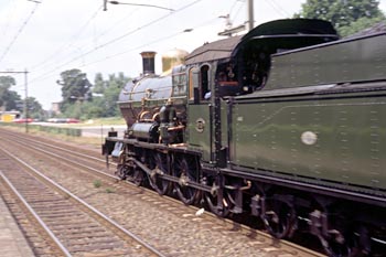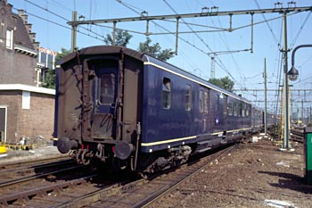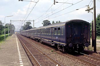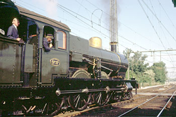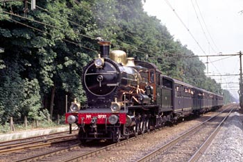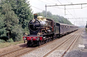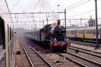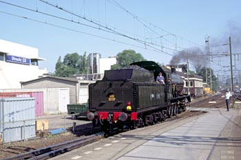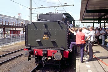 Op 27 juli 1989 achtervolgde ik loc 3737 per stoptrein. Door haasje-over te spelen kon ik foto's maken op Veenendaal-de Klomp, bij het inhalen van de stoomtrein in Maarn, daarna de doorkomst in Driebergen, vervolgens het inhalen van de stoomtrein bij Utrecht CS en ten slotte de loc na aankomst in Utrecht CS. De zwarte man op de loc is Dick Nieman, vrijwilliger bij de SHM en een van de stokers van loc 3737. |
