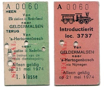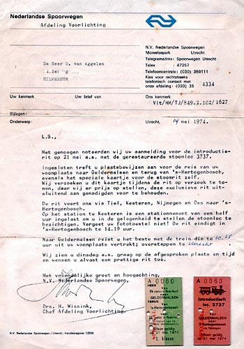 Persrit 21 mei 1974Dick van Aggelen werd dankzij een relatie uitgenodigd voor de persrit met de 3737 op 21 mei 1974. Met gratis eersteklaskaartje naar het vertrekpunt Geldermalsen. |